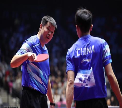 11月18日,辽宁队组合袁励岑/侯英超(左)在比赛中交流,他们在双打比赛中0比3不敌北京队组合马龙/王楚钦。