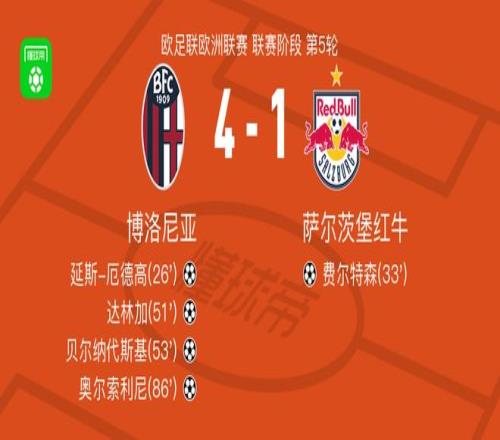 北京时间11月28日,欧足联欧洲联赛联赛阶段第5轮展开较量,博洛尼亚迎战萨尔茨堡红牛。比赛中,延斯-厄德高率先为博洛尼亚取得进球,随后费尔特森为萨尔茨堡红牛扳平比分。下半场易边再战,胡安-米兰达送出助攻,达林加建功帮助博洛尼亚再度领先。不久后,佐尔泰亚送出传球,贝尔纳代斯基破门扩大比分优势。比赛尾声阶段,奥尔索利尼攻入一球,进一步锁定胜局。最终全场比赛结束,博洛尼亚以4比1战胜萨尔茨堡红牛。