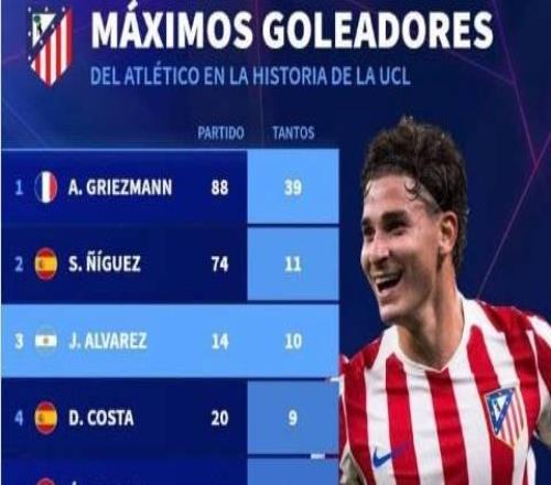 在今天凌晨进行的欧冠联赛阶段第5轮比赛中,马竞主场2-1击败国米,其中阿尔瓦雷斯打入进球。根据统计, 阿尔瓦雷斯已经代表马竞在欧冠中打进了10粒进球,位列队史欧冠进球榜第三名