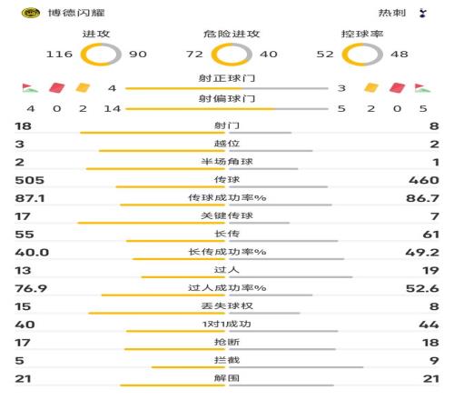 控球率方面,双方呈现势均力敌之势,博德闪耀控球率52%,热刺控球率48%。进攻次数上,博德闪耀116次,热刺90次。危险进攻次数方面,博德闪耀72次,热刺40次。