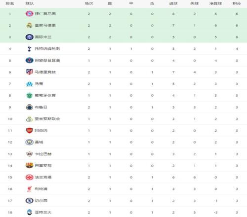随着皇马50,拜仁51,欧冠最新积分榜:利物浦01输球跌至第16
