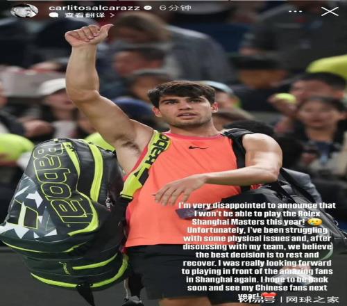 再来,我们将视线转到上海大师赛,就在今天,上海大师赛迎来一个让人遗憾的消息:阿尔卡拉斯宣布退出上海大师赛。