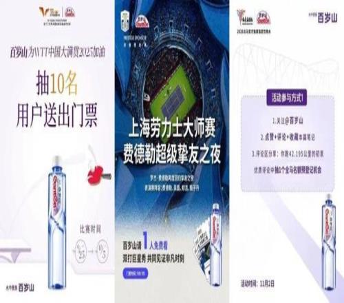 这样的抽奖活动并不局限在本站北京赛事——对百岁山这样的WTT全球顶级合作伙伴来说,从欧洲大满贯到澳门冠军赛等均有对应赠票,每逢比赛开票,球迷涌入品牌社媒点赞、评论等待抽取门票已成「惯例」。