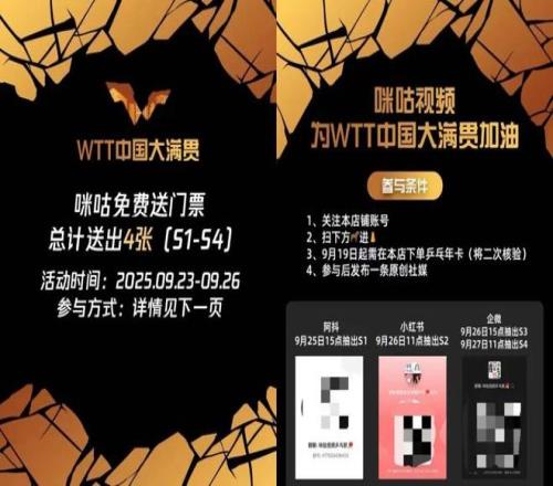 其中,WTT的官方转播合作伙伴咪咕,深谙乒乓球迷的核心需求。在赛事筹备阶段,咪咕便推出了「观赛礼包」产品,将WTT门票与全站会员权益进行捆绑销售。至于其他余票,咪咕也采用了相似的形式,球迷在官方渠道下单乒乓球年卡会员后,可以通过抖音、小红书和企业微信在不同时间抽取门票。