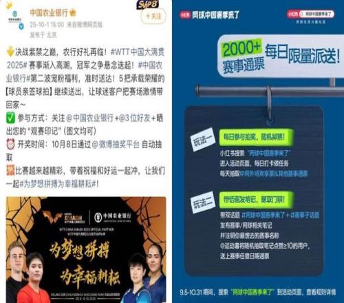与此同时,包括库迪、中国农业银行等在内的更多合作方则选择了社交媒体互动的路径,在小红书、微博、抖音等社媒平台,发布诸如「关注+转发,抽球迷送WTT门票」的活动层出不穷。