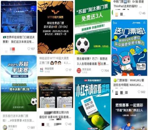 同样地,在体育赛事运营中,也会有一定数量的球票通过不同形式被赠出。当我们在社交媒体键入「体育赠票」并搜索时,就会发现中国网球公开赛、上海大师赛、中超乃至此前爆火的苏超皆有赠票活动。