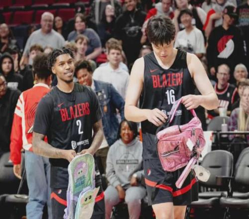 而这一个球迷日,开拓者所呈现的不止是比赛,还有表演,他们上演了NBA常见的“新人欢迎”内容:让新秀球员背上了儿童书包。