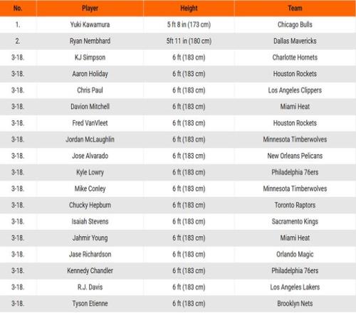 此外,有16名球员的身高正好是6英尺,也就是1米83,其中包括了保罗、范弗里特、康利、洛瑞、阿尔瓦拉多等多位叱咤NBA的名将。