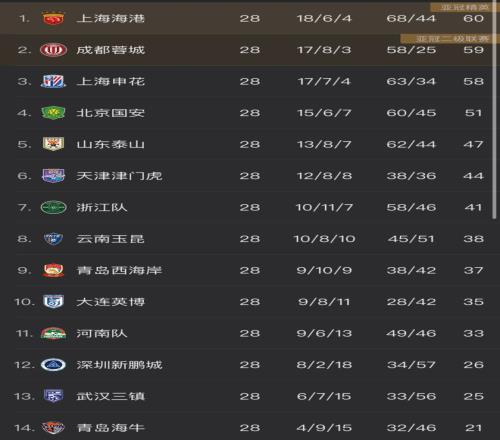 中超形势:海港1分领跑!争冠3队齐不胜仅差2分+最后2轮各1场硬仗