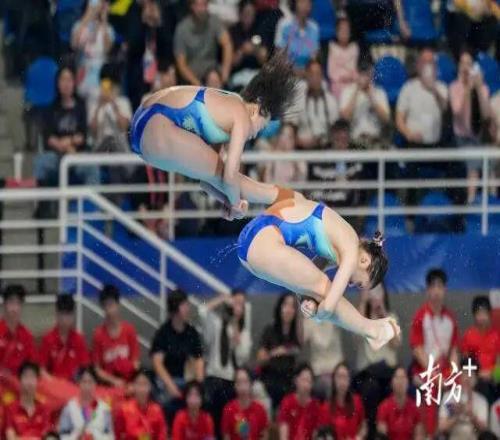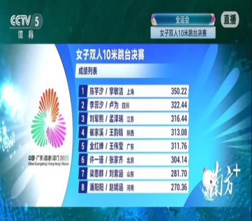 陈芋汐/掌敏洁获得十五运会跳水女子双人10米台金牌,全红婵/王伟莹获得第五名