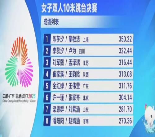 北京时间11月6日,第十五届全运会女子双人十米台决赛落下帷幕。上海组合陈芋汐、掌敏洁延续了预赛的完美发挥,以350.22分拔得头筹,收获冠军!四川队的李蕊汐/卢为收获亚军,江苏队刘军熙/孟泽瑞夺得季军。