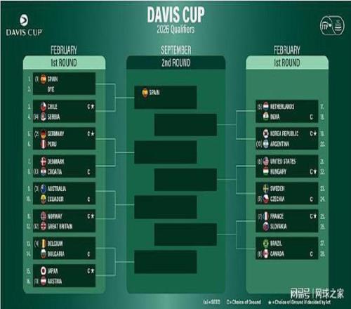 我们再来关注戴维斯杯。北京时间昨晚,2026赛季戴维斯杯的签表出炉,27支球队分成两个组,争夺7个决赛圈八强席位。其中,卫冕冠军意大利队直接晋级八强,今年的亚军西班牙队享受首轮轮空待遇,静待塞尔维亚队与智利队之间的胜者。