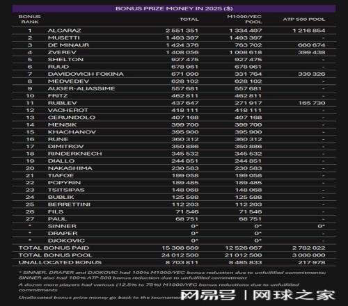 此外,还出现了一些值得关注的趋势。达维多维奇在ATP 500奖金榜中排名第四,总收入位列第14位;德约科维奇跌至奖金榜第九,且仍有进一步下滑的风险;德米纳尔通过最大化参加顶级赛事,成功跻身前四。随着新赛季的临近,阿尔卡拉斯与辛纳之间围绕“奖金霸主”地位的竞争,依然充满悬念。(来源:网球之家 作者:火花)