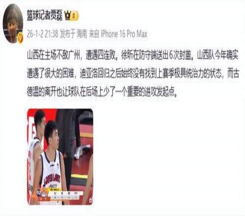 主场爆冷还输给广州队之后,篮球记者贾磊老师认为:山西在主场不敌广州,遭遇四连败。徐昕在防守端送出6次封盖。山西队今年确实遭遇了很大的困难,迪亚洛回归之后始终没有找到上赛季极具统治力的状态,而古德温的离开也让球队在后场上少了一个重要的进攻发起点。