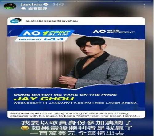 周董这次参加的是澳网期间的特别娱乐赛事One Point Slam(“一球制胜”)。