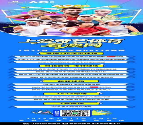 北京时间1月31日,爱奇艺体育全程直播的2026澳大利亚网球公开赛将进入倒数第2个比赛日。女双决赛、男双决赛、女单决赛先后上演。