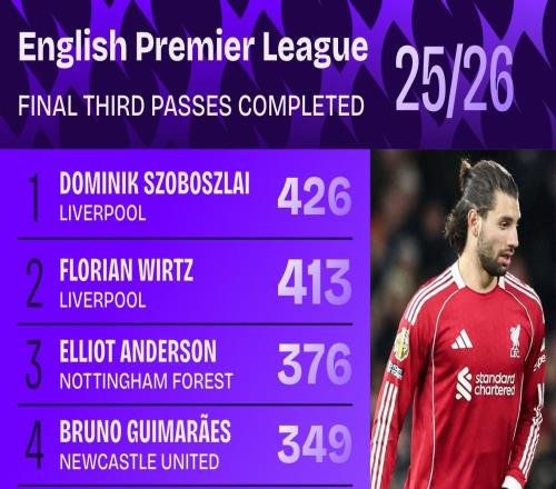 周三,知名数据机构Squawka统计了本赛季英超进攻三区成功传球数据,索博斯洛伊、维尔茨位列前二,利物浦有4人进榜单前十名。