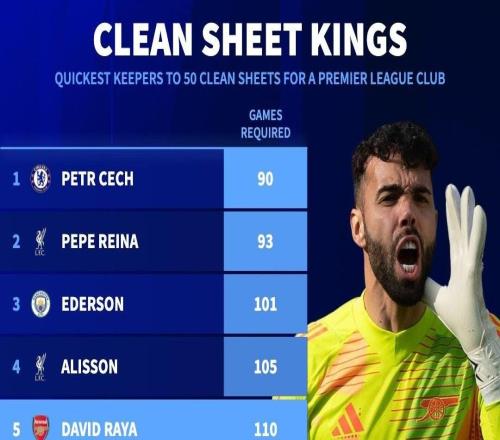 英超俱乐部最快达成50场零封门将前10:切赫第1,拉亚第5