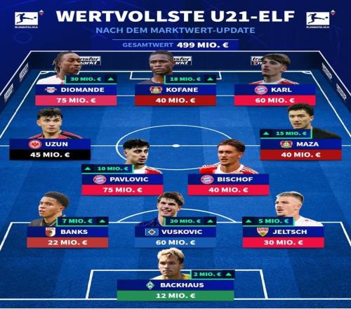 北京时间3月21日,在更新了德甲球员的身价之后,德转还列出了更新之后德甲最贵的U21阵容,扬-迪奥曼德和亚历山大-帕夫洛维奇同以7500万欧元的身价领衔,伦纳特-卡尔、比朔夫、詹-乌