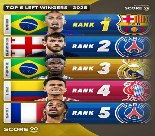 北京时间12月31日,Score90公布了根据他们的数据统计选出的2025年五大前锋,其中左边锋第一是拉菲尼亚, 右边锋第一是亚马尔,中锋第一是姆巴佩。Score90评选的2025年五大左边锋