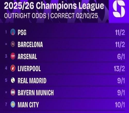 谁是欧冠热门?枪手压倒巴黎巴萨?欧冠 10-02 18:34欧冠联赛阶段2轮战罢,目前拜仁、皇马、巴黎圣日耳曼、国际米兰、阿森纳、卡拉巴赫6支球队保持全胜。最新夺冠赔率榜上,卫冕冠军