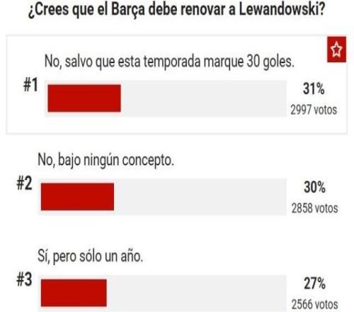 巴萨应否续约莱万?你怎么看西甲 10-17 11:13莱万与巴萨合同明夏到期,《马卡》报就巴萨是否应该与之续约发起网络调查,共9488名球迷参与投票,有30%认为无论如何都不续约—— ①不